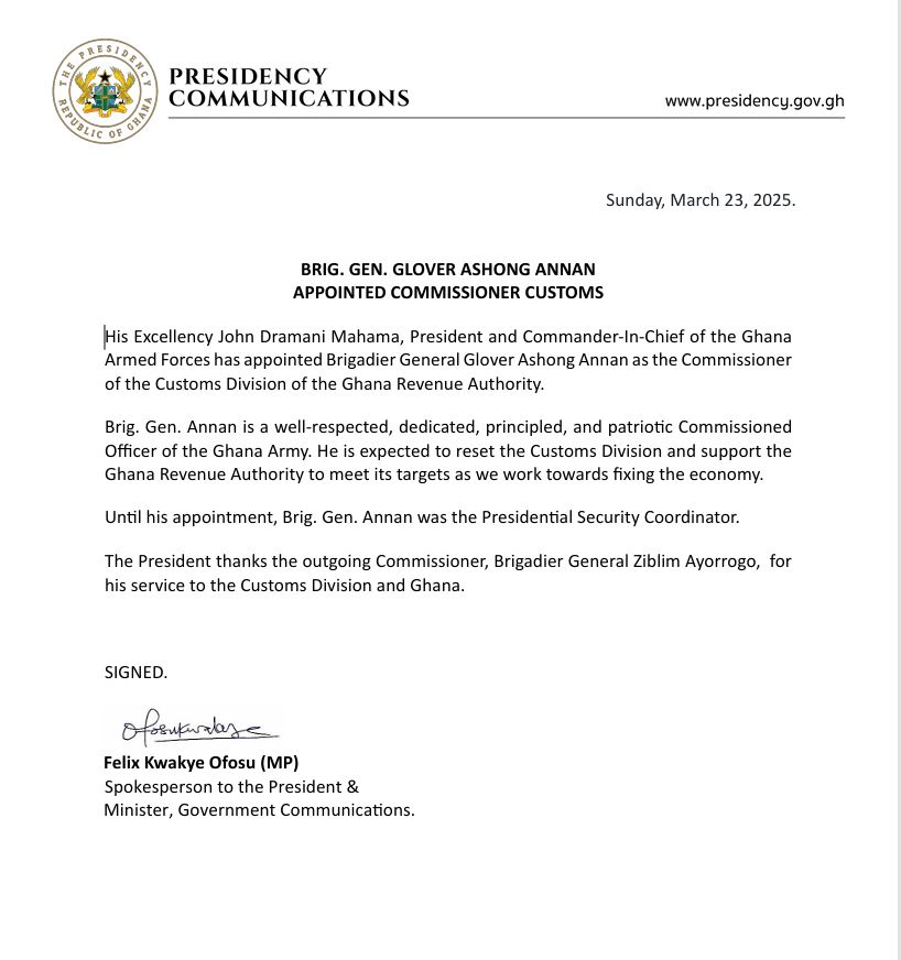 President John Dramani Mahama has appointed Brigadier General Glover Ashong Annan as the new Commissioner of the Customs Division of the Ghana Revenue Authority (GRA).