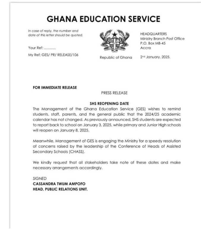 In a press release issued on January 2, 2025, the Head of the Public Relations Unit at GES, Cassandra Twum Ampofo, reiterated that the 2024/25 academic calendar remains unchanged. She stated, “As previously announced, SHS students are expected to report back to school on January 3, 2025, while primary and Junior High Schools will reopen on January 8, 2025.”