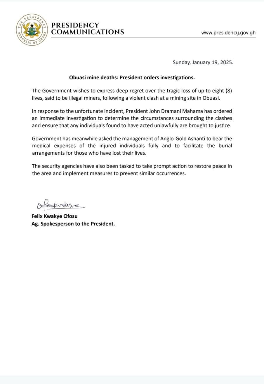 “The Government wishes to express deep regret over the tragic loss of up to eight (8) lives, said to be illegal miners, following a violent clash at a mining site in Obuasi.