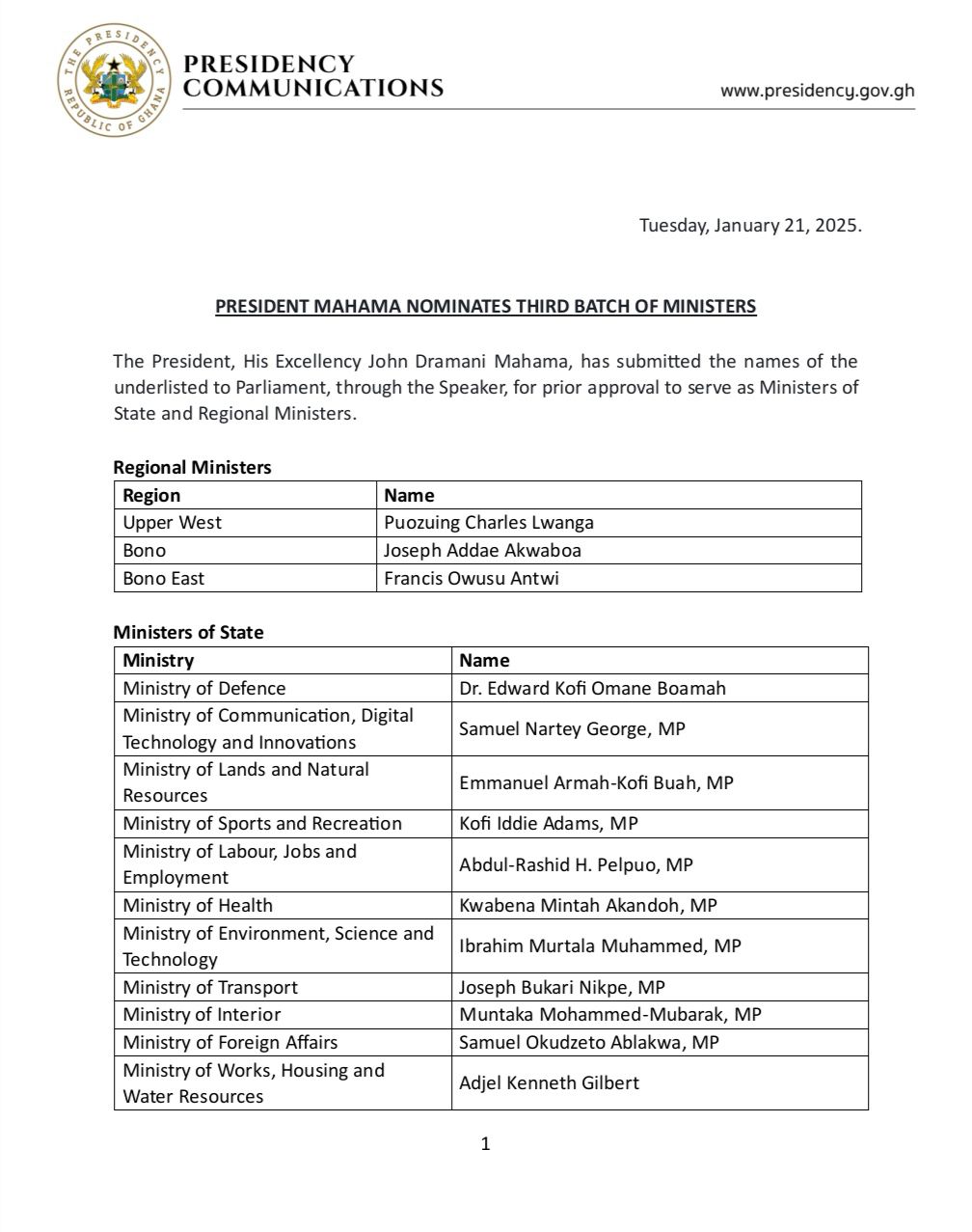 The names, delivered through the Speaker of Parliament on Tuesday, January 21, 2025, include individuals expected to serve as Ministers of State and Regional Ministers across various sectors and regions.
