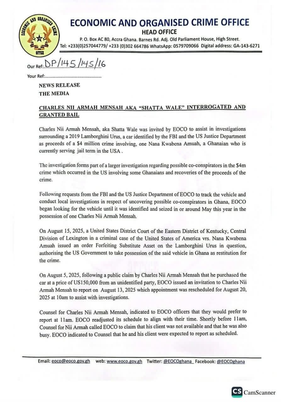 In a statement issued on Thursday, August 21, EOCO confirmed that Shatta Wale was invited to assist in ongoing investigations into a 2019 Lamborghini Urus, which American authorities have identified as proceeds of a $4 million fraud case involving Ghanaian national Nana Kwabena Amuah, who is currently serving a jail term in the United States.