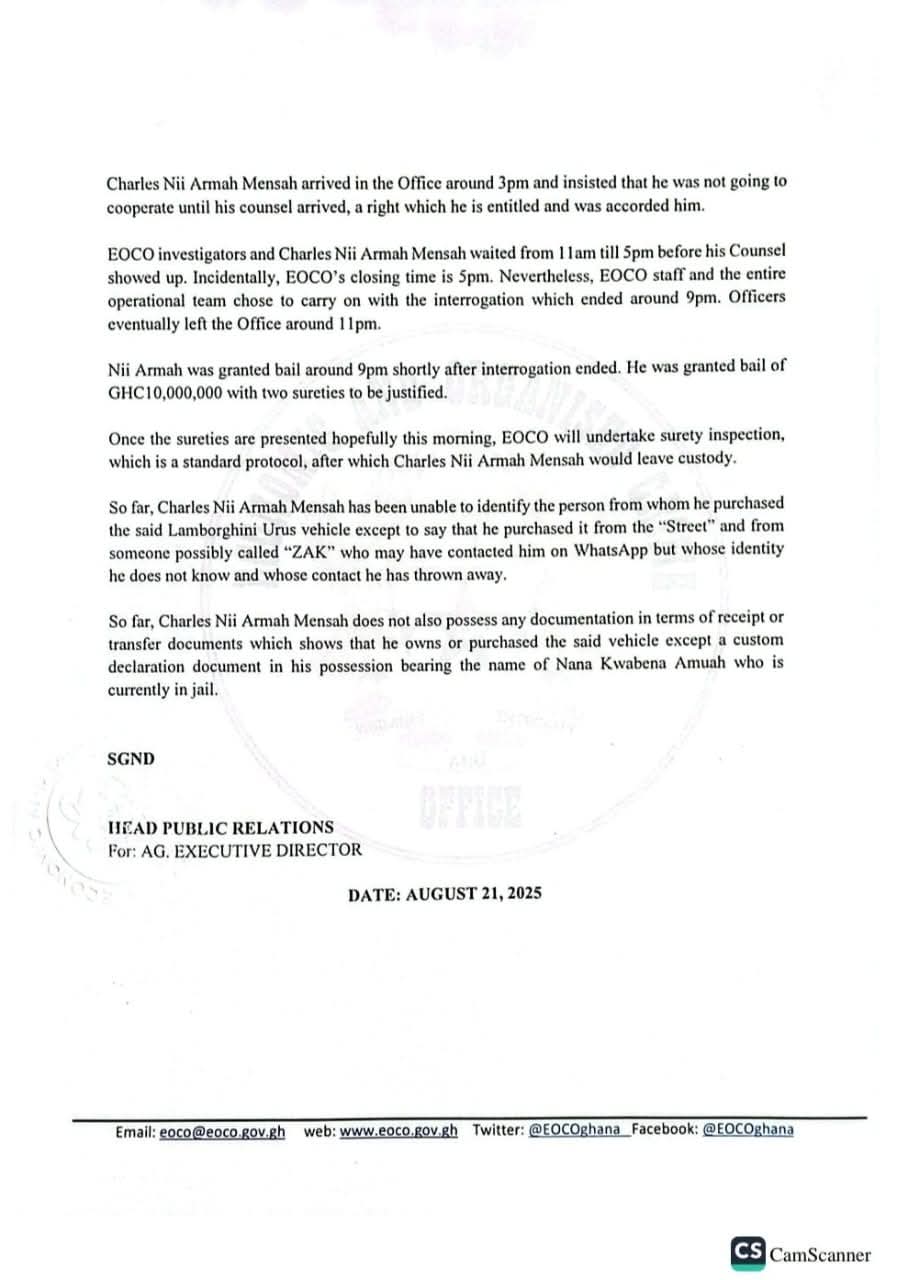 According to the statement, “Nii Armah was granted bail around 9 pm shortly after interrogation ended. He was granted bail of GH₵10,000,000 with two sureties to be justified.”